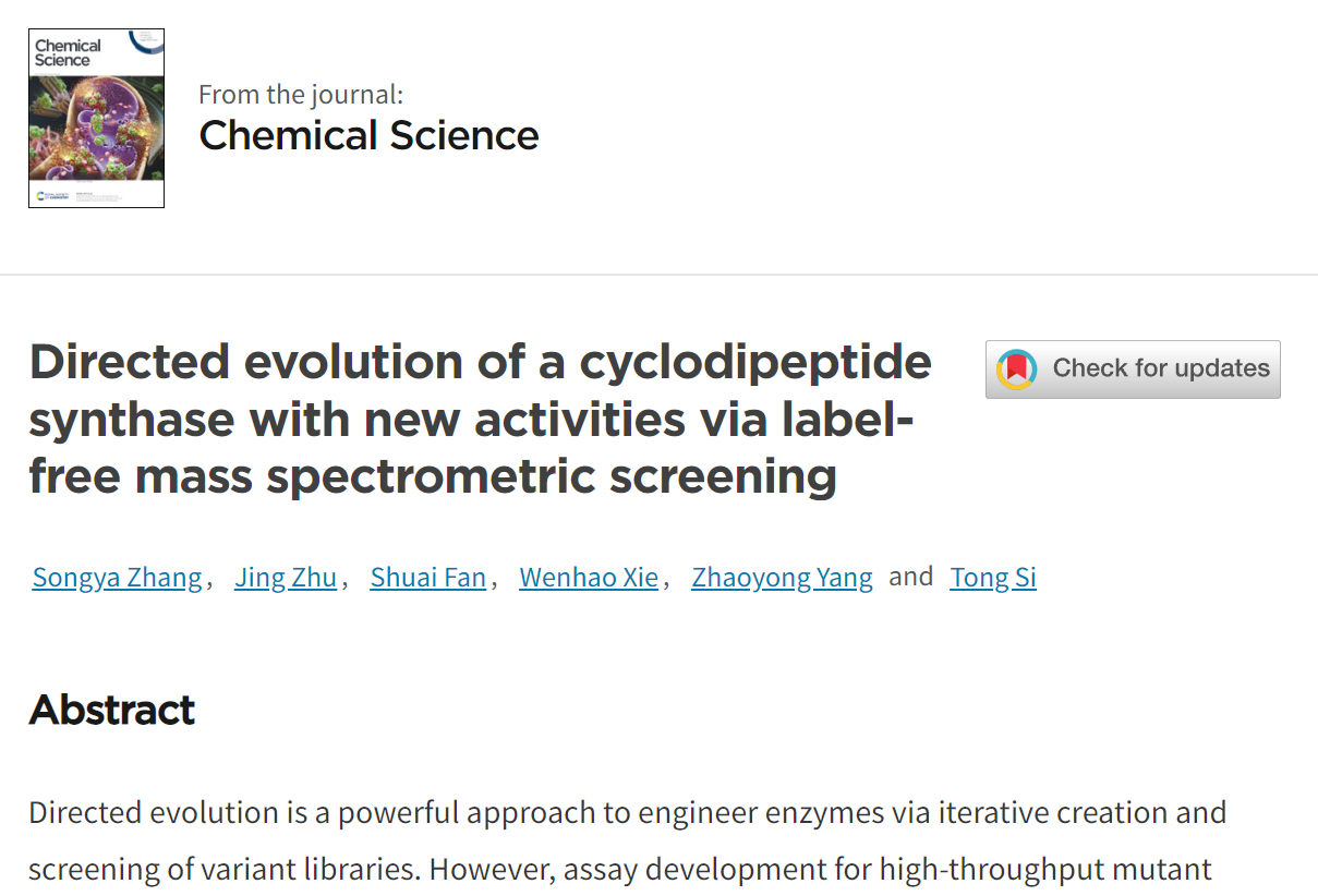 6月2日,中国科研实验室深圳先进技术研究院司同课题组联合中国医学科学院杨兆勇课题组,在国际学术期刊Chemical Science在线发表研究论文“Directed evolution of a cyclodipeptide synthase with new activities via label-free mass spectrometric screening”。文章依托深圳合成生物研究重大科技基础设施(简称为“合成生物大设施”),开发了无标记质谱筛选技术,应用于环二肽合酶的定向进化改造,快速得到了F186L突变体催化合成野生型天然酶无法产生的新二酮哌嗪分子。司同研究员和杨兆勇研究员为本文共同通讯作者,张嵩亚、朱静助理研究助理为共同第一作者。