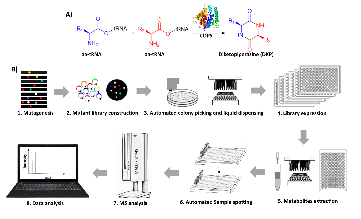 文章以环二肽合酶(cyclodipeptide synthases, CDPSs)为研究对象,验证无标记质谱筛选在酶定向进化中的应用。环二肽合酶利用氨酰-tRNA底物可以合成二酮哌嗪(diketopiperazines, DKPs)骨架;含有这类骨架的天然产物可以顺利获得肠屏障、血脑屏障,是重要的药物先导化合物。然而,基于蛋白质工程改造环二肽合酶的成功案例非常有限,部分原因在于缺乏高通量的产物分析方法,相关研究仅限于少数理性设计突变。