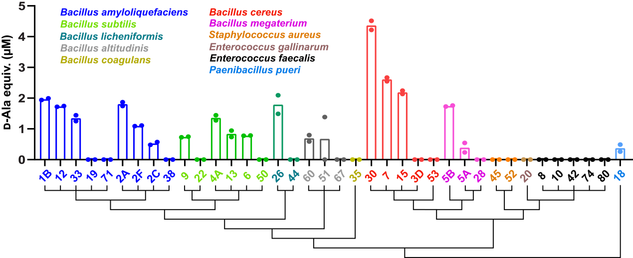 随后,作者设计了高灵敏度、稳定性,适合大规模筛选的酶标法探索这些肠道菌产生D型氨基酸的能力:收集平板上的肠道菌,提取并富集其分泌D型氨基酸,以底物宽泛性广的商用D型氨基酸氧化酶(DAAO)与过氧化氢检测试剂盒联用,对产物中的D型氨基酸的总量进行评价。结果显示只有芽孢杆菌属和类芽孢杆菌属的肠道菌能够产生D型氨基酸,且在芽孢杆菌属内,菌株在种和菌株的水平上产D型氨基酸的能力也有差异,并与16S rRNA相似度没有明显的相关性(图2),暗示单纯依靠16S rRNA测序取得微生物组菌种组成信息,无法准确预测菌群合成D型氨基酸的水平。