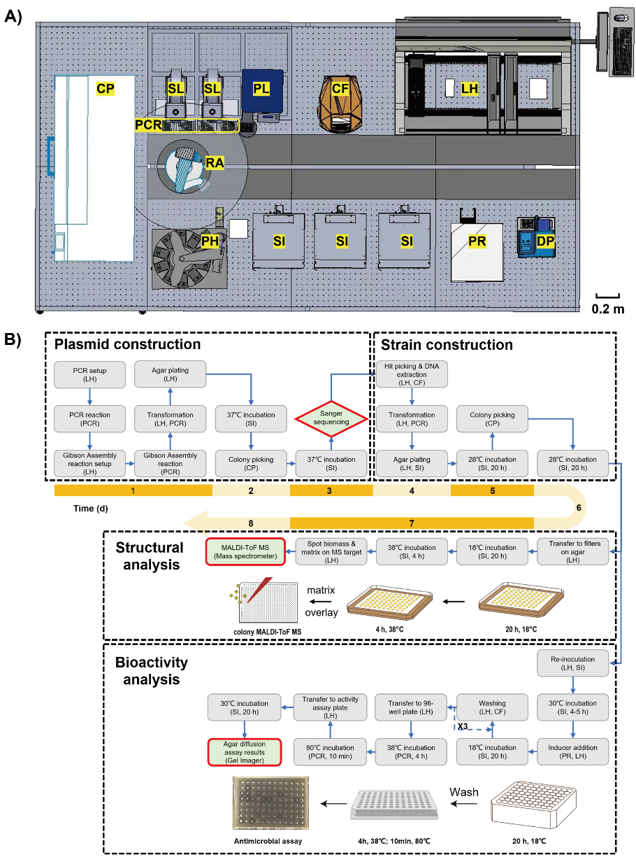 图1:A)自动化功能岛布局,B)羊毛硫肽突变文库自动化构建和筛选流程