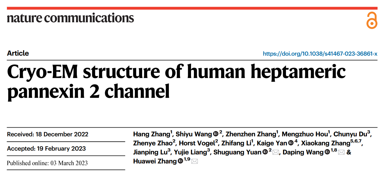 1. Zhang, H., Wang, S., Zhang, Z. et al. Cryo-EM structure of human heptameric pannexin 2 channel. Nat Commun 14, 1118 (2023).