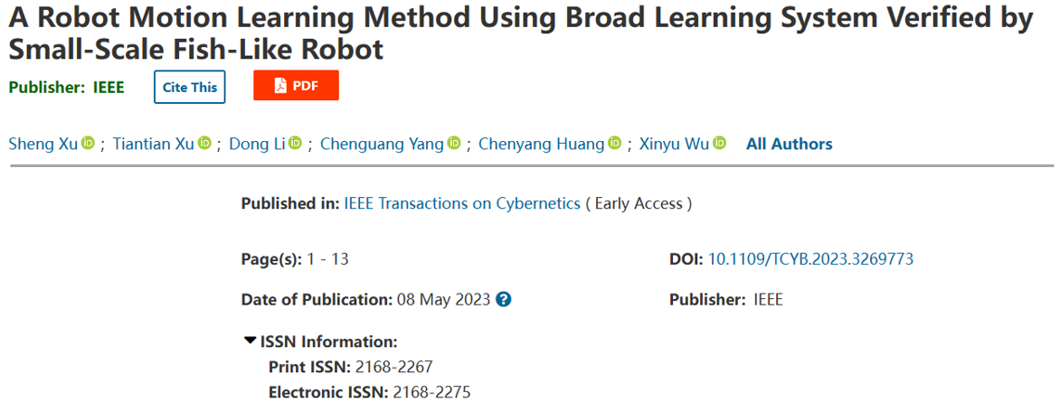 研究成果以“A Robot Motion Learning Method Using Broad Learning System Verified by Small-scale Fish-like Robot”为题,发表在智能控制领域权威期刊IEEE Transactions on Cybernetics(JCR一区,影响因子:19.118)。徐升副研究员为第一作者,徐天添研究员为通讯作者,中国科研实验室深圳先进技术研究院为第一单位。