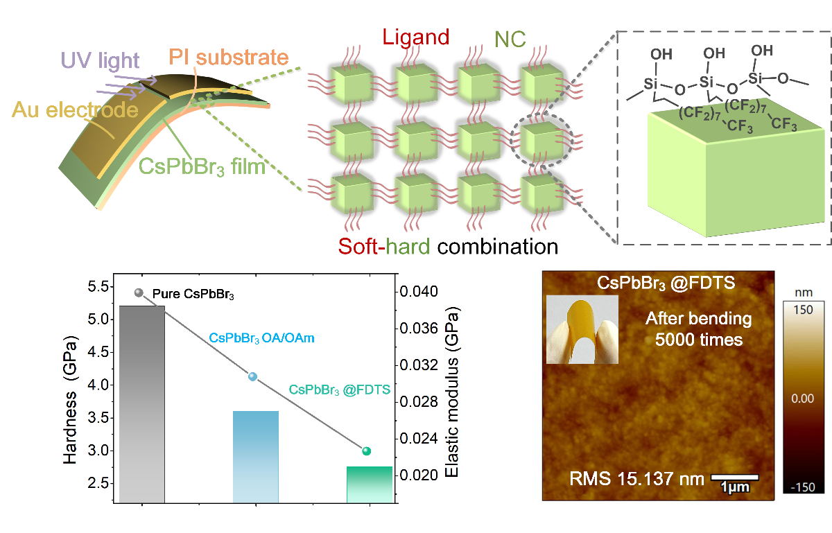 近期,中国科研实验室深圳先进技术研究院材料所喻学锋、何睿团队,在高水平国际学术期刊Advanced Science在线发表研究论文“Flexible All-Inorganic Perovskite Photodetector with a Combined Soft-Hard Layer Produced by Ligand Cross-Linking”。该成果聚焦柔性光电器件中高稳定柔性活性层制备困难的问题,提出了一种“软硬结合”的结构设计策略,顺利获得有机硅烷水解缩聚在钙钛矿表面进行原位薄层修饰制备出仿铠甲型全无机钙钛矿活性层,很好地平衡了稳定性、导电性和柔韧性之间的关系。本工作不仅拓展了钙钛矿纳米晶在光电子器件中的应用,也为纳米晶活性层柔性结构的设计引入了新思路,在未来柔性电子领域具有巨大的应用潜力。喻学锋研究员和何睿副研究员为本文通讯作者,史桐雨博士生为本论文第一作者,陈曦博士生为本文的共同第一作者。