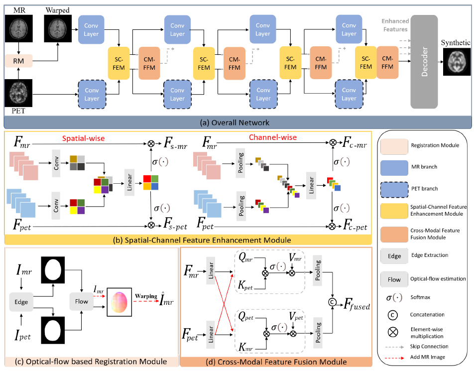图1 提出的基于光流配准的PET/MR成像技术,(a)提出的OIF-Net整体结构,包含的两个分支分别处理PET/MR两种模态输入和特征融合,(b)空间-通道特征增强模块,(c)光流配准模块,(d)跨模态特征融合模块