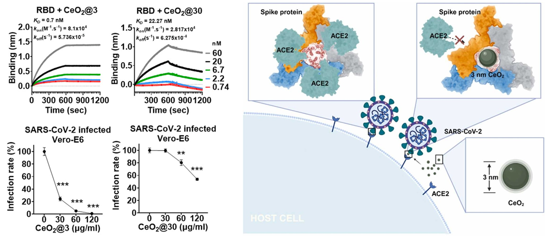 1 纳米颗粒的大小对抗病毒活性至关重要。330 nmCeO2纳米颗粒RBD的亲和力类似,但抗病毒效果相差很多,这是由于3 nmCeO2纳米颗粒可以插入S蛋白三聚体的空腔中,阻断RBD-ACE2相互作用,进而具有高效的抗病毒活性。