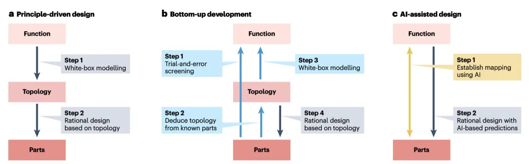 要对系统进行理性设计,需要建立能对系统进行精确预测的模型。通常,模型是对生物系统内部机制的抽象,能帮助我们理解功能背后的系统逻辑架构(拓扑结构)。对于较为简单的生物功能,我们有成熟的理论模型。因此,合成生物学早期的很多经典工作采用的是这一范式。这一“自上而下”的范式,第一时间顺利获得建立数理模型探索功能产生的原理,取得能产生目标功能的系统拓扑结构,然后根据拓扑结构设计具体的生物元件。