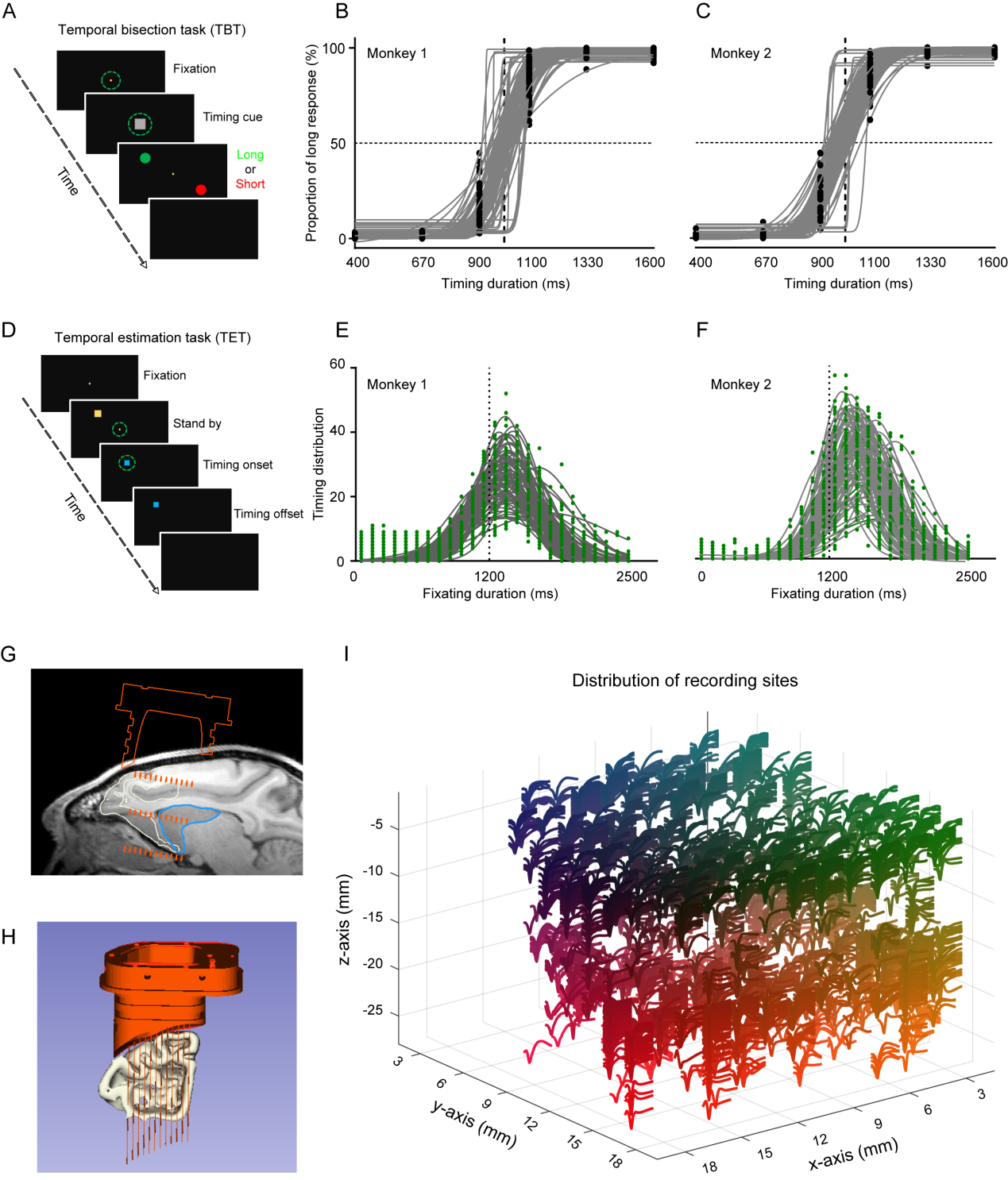 本研究对猕猴召开了两项时距知觉任务的训练,分别是时间分辨任务(Temporal bisection task,TBT)和时间估计任务(Temporal estimation task,TET)(图1)。其中,TBT任务是向猕猴呈现时长不定(0.4、0.67、0.9、1.1、1.33、1.6s)的视觉刺激,并要求猕猴在视觉刺激消失后判断刺激的呈现时长是比 1s 长还是短。结果表明,刺激呈现时长越长,其判断为“长”的概率就越高,表明猕猴掌握了 TBT 任务的规则。在 TBT 中,猕猴是在刺激消失后才对其呈现时长进行判断,属于回顾性计时。而TET任务则是给猕猴呈现一个视觉刺激,并由其顺利获得注视决定在何时结束该刺激的呈现。当猕猴对刺激的注视时长处于 1.2 – 2.5s 之间时,能够取得奖赏。结果显示,猕猴也成功掌握了该计时规则。在 TET 中,猕猴对注视时长有预期,且需要在判断注视时长到达阈限后结束注视,属于前瞻性计时。