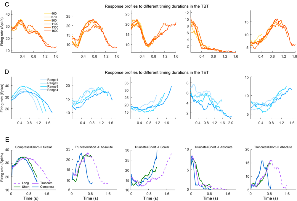 研究人员顺利获得植入慢性可移动电极,从猕猴的前额叶和纹状体记录了3000多个神经元对两项时距知觉任务的反应。在TBT中,猕猴无法预期视觉刺激的呈现时间,无论计时的长短,许多神经元的发放率并未随着刺激呈现时长变化而改变其发放模式,称为“绝对编码(Absolute coding)”。在TET中,许多神经元的发放率对不同主观时长呈现相似的模式,并可顺利获得压缩实现对齐,称为“可压缩编码(Scalar coding)”,也称 “相对编码(Relative coding)”。这一结果提示了神经元以不同的模式编码前瞻性和回顾性计时中的时间信息(图2)。
