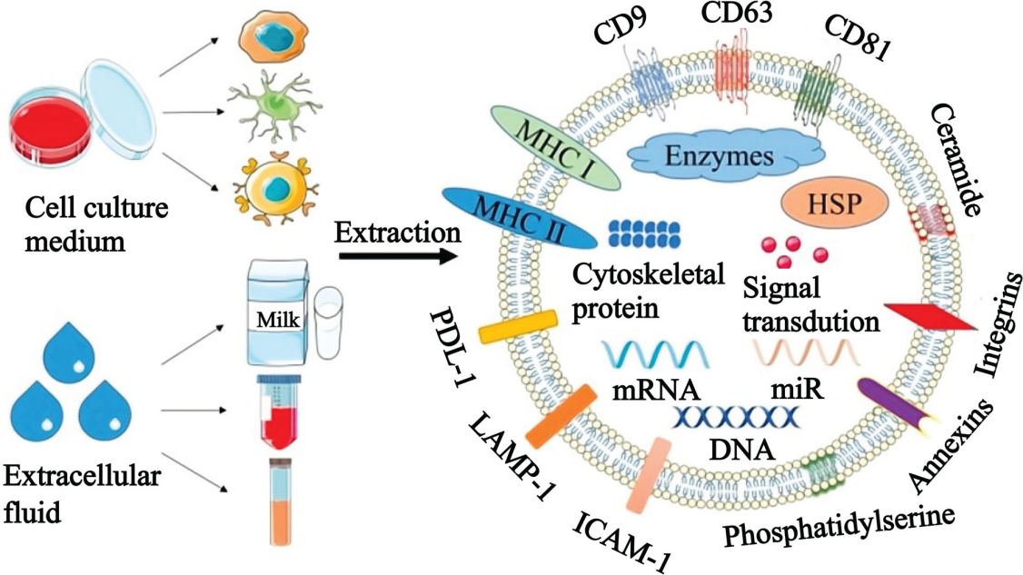 外泌体作为一类尺寸介于30至200 nm之间的小型膜状囊泡,可由健康细胞和肿瘤细胞释放,其携带着来自其亲本细胞的丰富的分子信息(如 DNA、RNA 和蛋白质),凭借独特的结构和组成使其成为重要生物标志物(图1)。外泌体参与细胞间通讯、血管生成、免疫反应和癌症转移等关键细胞过程,与生命活动息息相关。近年来对外泌体的特异性识别和表征成为了生物医学研究和液体活检领域的焦点。研究者们致力于开发更加精准、高效的方法来捕捉和分析外泌体,以期在疾病诊断、治疗监测以及新药研发等方面取得突破性进展。