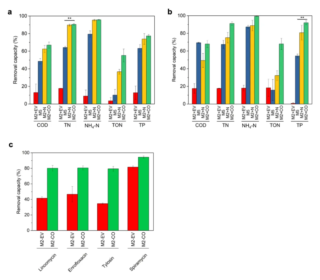 图 3. 细胞色素 P450 对畜牧业废水的解毒测试。顺利获得 M2 与空载体对照(M2+EV)、M5、过表达天然 A23292 的 M2(M2+N)和过表达密码子优化的 A23292 的 M2(M2+CO),去除(a)鸭场和(b)猪场废水中的化学需氧量(COD)、总氮(TN)、铵氮(NH4-N)、总有机氮(TON)和总磷(TP)。(c)在 BG-11 中,顺利获得过表达密码子优化的 A2329 的 M2 抗生素(500 μg/L)去除率