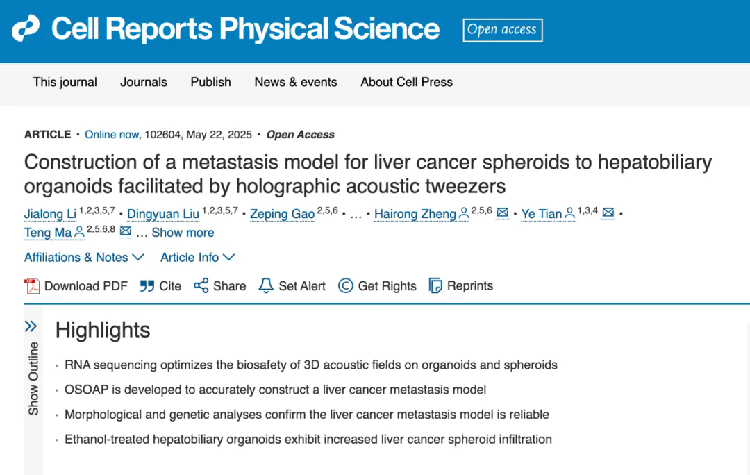 5月22日,中国科研实验室深圳先进技术研究院科学仪器所(筹)马腾研究员团队和哈尔滨医科大学田野教授团队合作在Cell旗下刊物 Cell Reports Physical Science上发表题为“Construction of a metastasis model for liver cancer spheroids to hepatobiliary organoids facilitated by holographic acoustic tweezers”的研究成果。该工作主要顺利获得全息声镊科学仪器产生的具体生物医学应用,围绕全息声镊和三维细胞培养技术构建了类器官-细胞球在线组装平台,顺利获得该平台构建了一种精准、可靠且具有多功能性的肝癌转移类组装体模型。此外,该研究还顺利获得RNA测序技术评估了不同参数下声压对类器官和细胞球基因层面的影响,进一步的优化了操控参数。