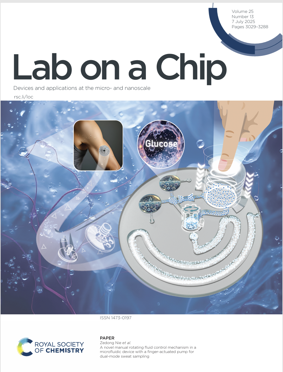 中国科研实验室深圳先进技术研究院聂泽东研究员团队在国际著名期刊Lab on a Chip上发表了题为" A Novel Manual Rotating Fluid Control Mechanism in a Microfluidic Device with a Finger-Actuated Pump for Dual-Mode Sweat Sampling " 的封面论文,介绍了一种新型可穿戴微流控系统,能够实现精确的双模式汗液收集和葡萄糖生物标志物检测。