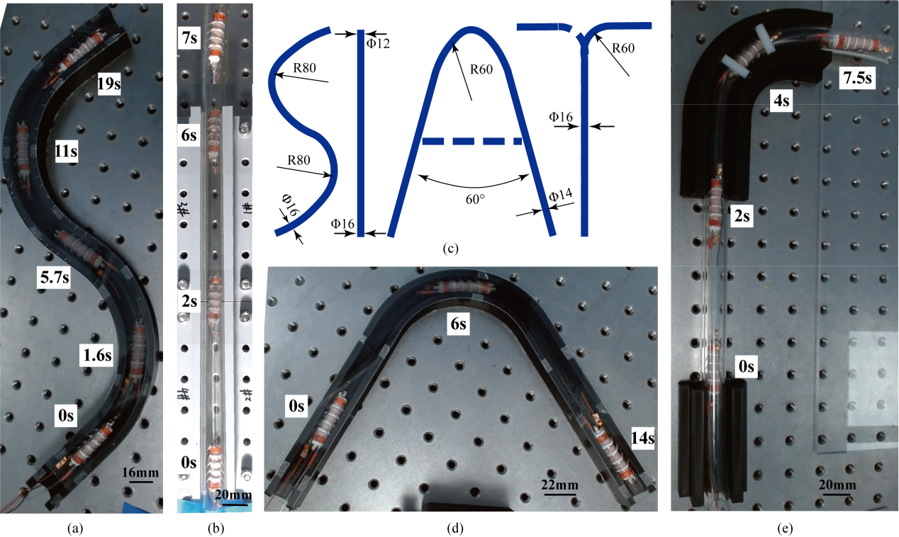 5)高适用性:在没有优化鬓毛材质的情况下,机器人有效行程可达4m以上,且能顺利获得金属管道以及复杂弯曲管道(图7)。