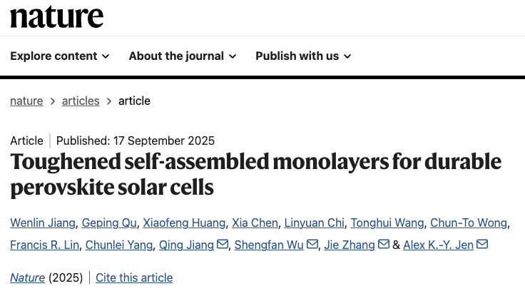 合作团队开发出了一种普适性的SAM分子原位交联构象强化策略,解决了SAM在高效率钙钛矿基光伏技术中的稳定性难题,对促进反式钙钛矿光伏技术和下一代钙钛矿基叠层光伏技术的商业化应用具有重要意义。