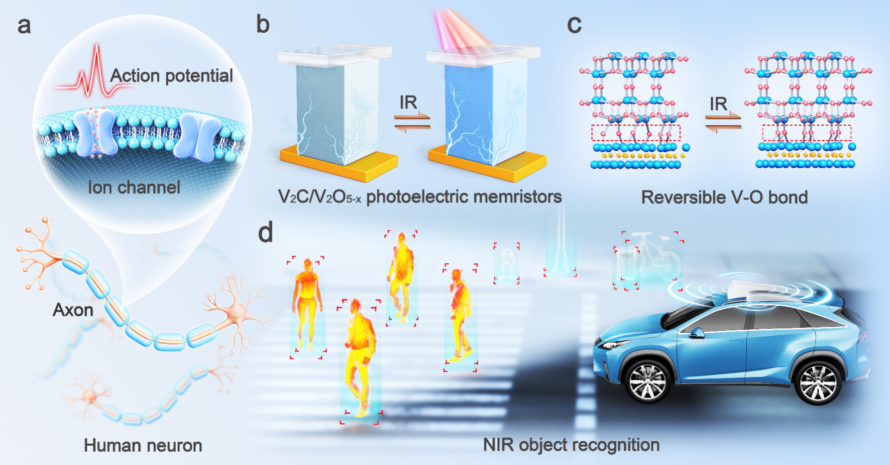 图1 | 基于二维碳化钒/氧化钒异质结构的人工感知神经元实现多色近红外目标识别示意图。