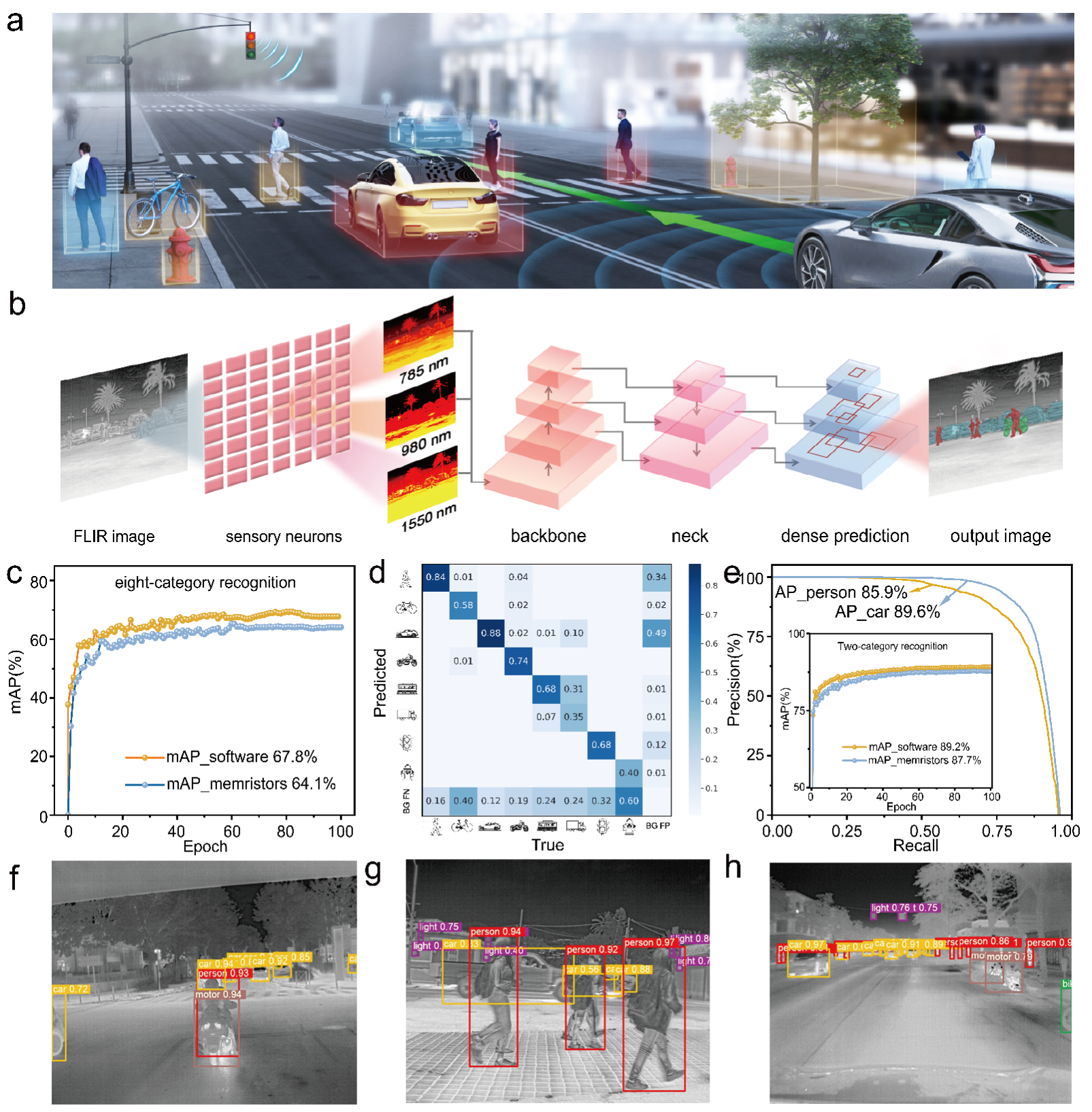 复杂驾驶场景中关键物体的精准检测与识别:将V2C/V2O5-x忆阻器构建的人工感知神经元系统结合YOLOv7算法模型构建人工神经网络架构,在FLIR数据集上对智能驾驶场景中汽车和行人的平均识别准确率可以达到87.7%和89.6%,展现出在复杂环境下的感知潜力(图4)。